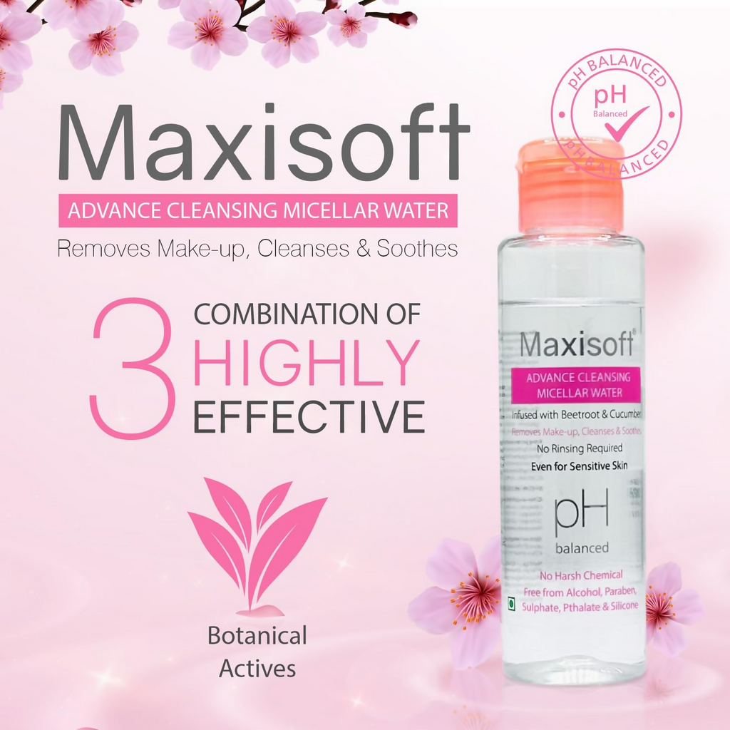 Paraphrase: Maxisoft Advance Cleansing Micellar water About the Product Maxisoft Advance Cleaning Micellar water About the Product: Maxisoft Advance Cleaning Micellar water is made up of purified, demineralized water, along with micelles, which are tiny balls of oil that stay suspended in the water. it is very effective in removing this surface-level grime without stripping the oil from your skin, which can throw off the skin’s natural balance.