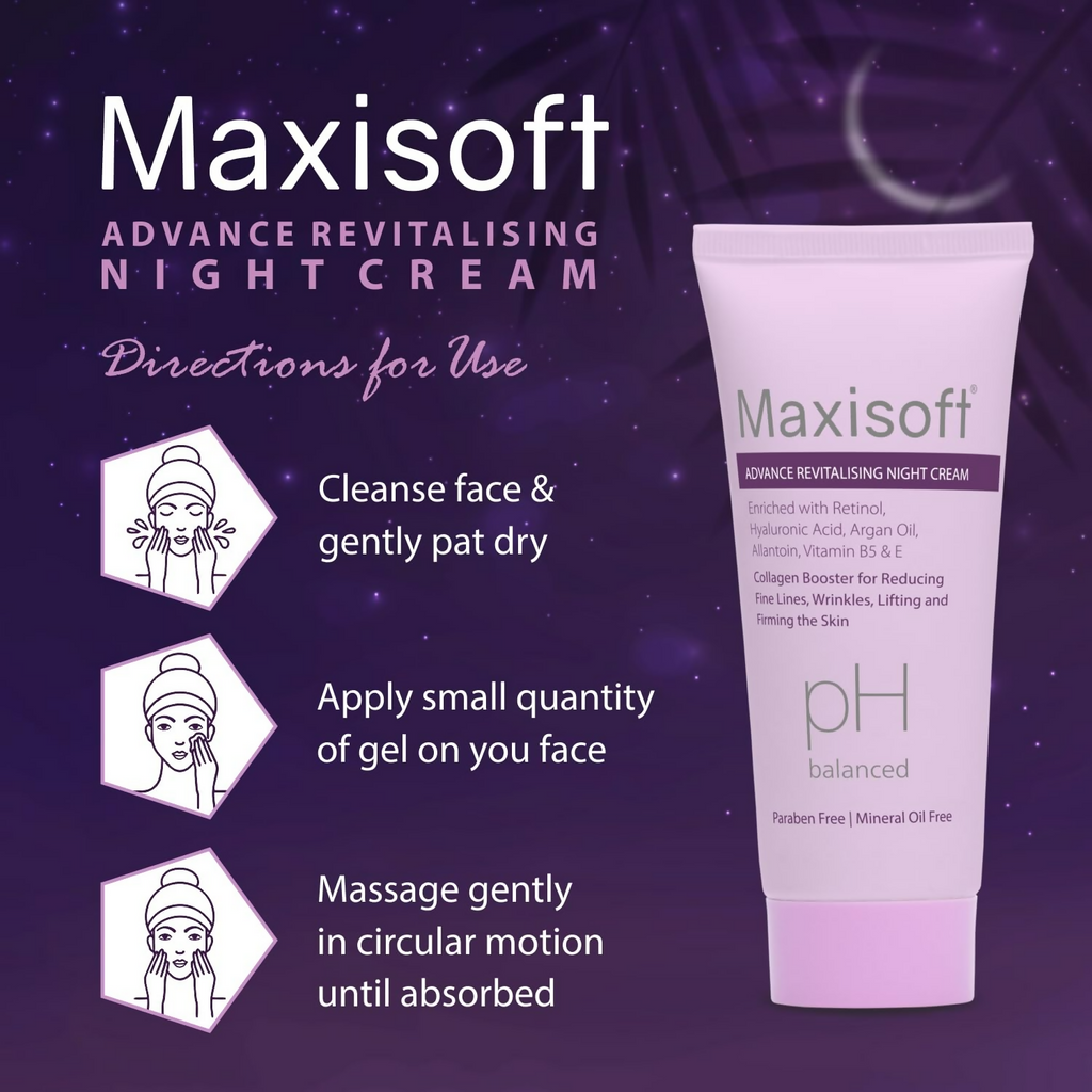 Paraphrase: Maxisoft Advance Revitalising Night Cream About the Product: Read the label instruction carefully before use. Maxisoft Advance Revitalizing Night Cream must not be applied to or on infected or broken skin. Avoid usage in case you are allergic to any of the ingredients mentioned on the product pack. Avoid usage in case you are allergic to any of the ingredients mentioned on the product pack.
