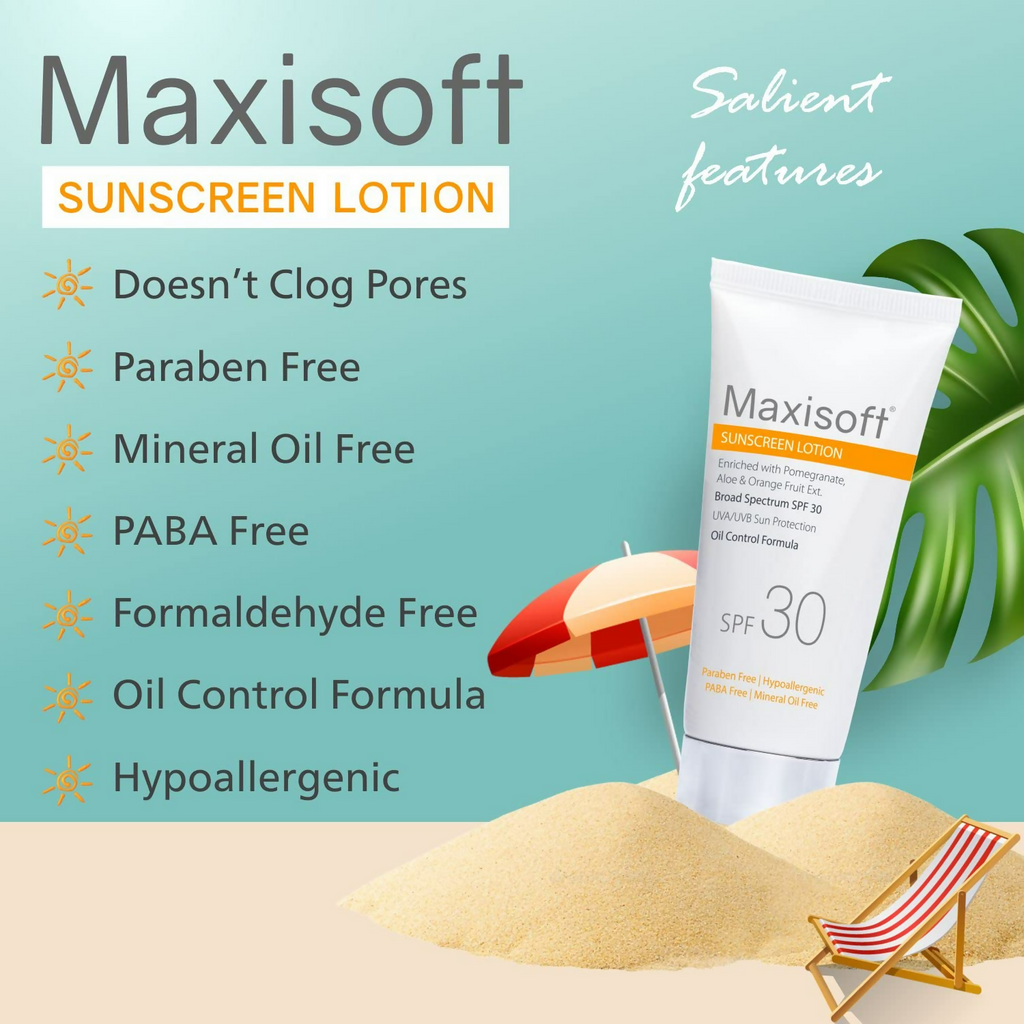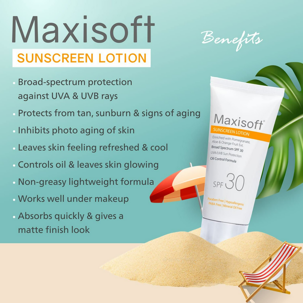 Paraphrase: Maxisoft Sunscreen SPF 30 Lotion About the Product: Sunscreen for men & women SPF 30+ blocks up to 97% of harmful rays of UVB which causes sunburns & shields from UVA rays which cause dark spots, premature aging, and skin darkening.