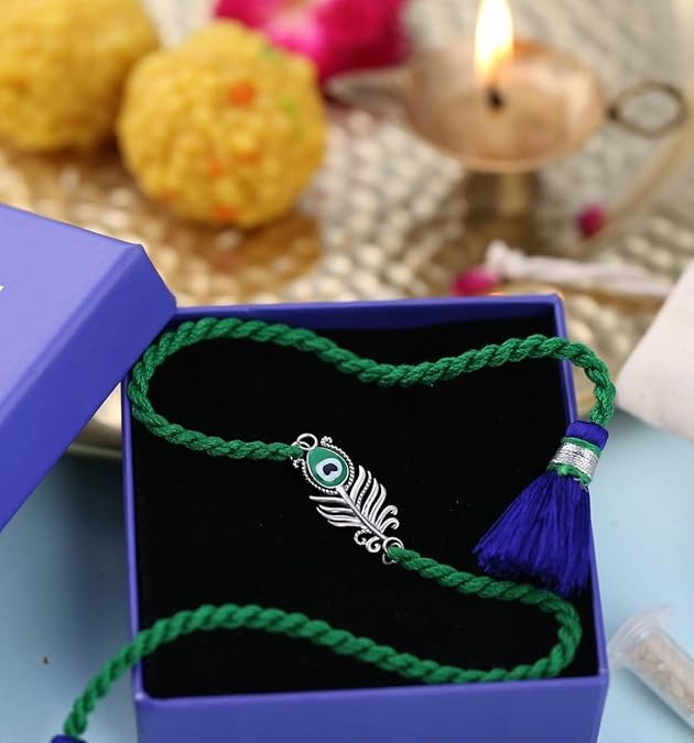 MEENAKARI HERITAGE JEWELLERY 925 Sterling Silver Morpankh Peacock Feather Krishna Rakhi Bracelet Set with Roli Chawal and Rakshabandhan Greeting Card For Men
