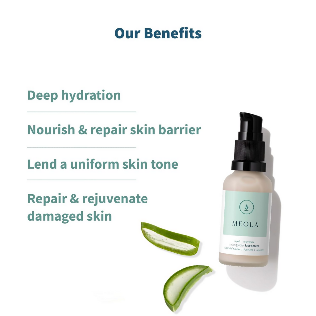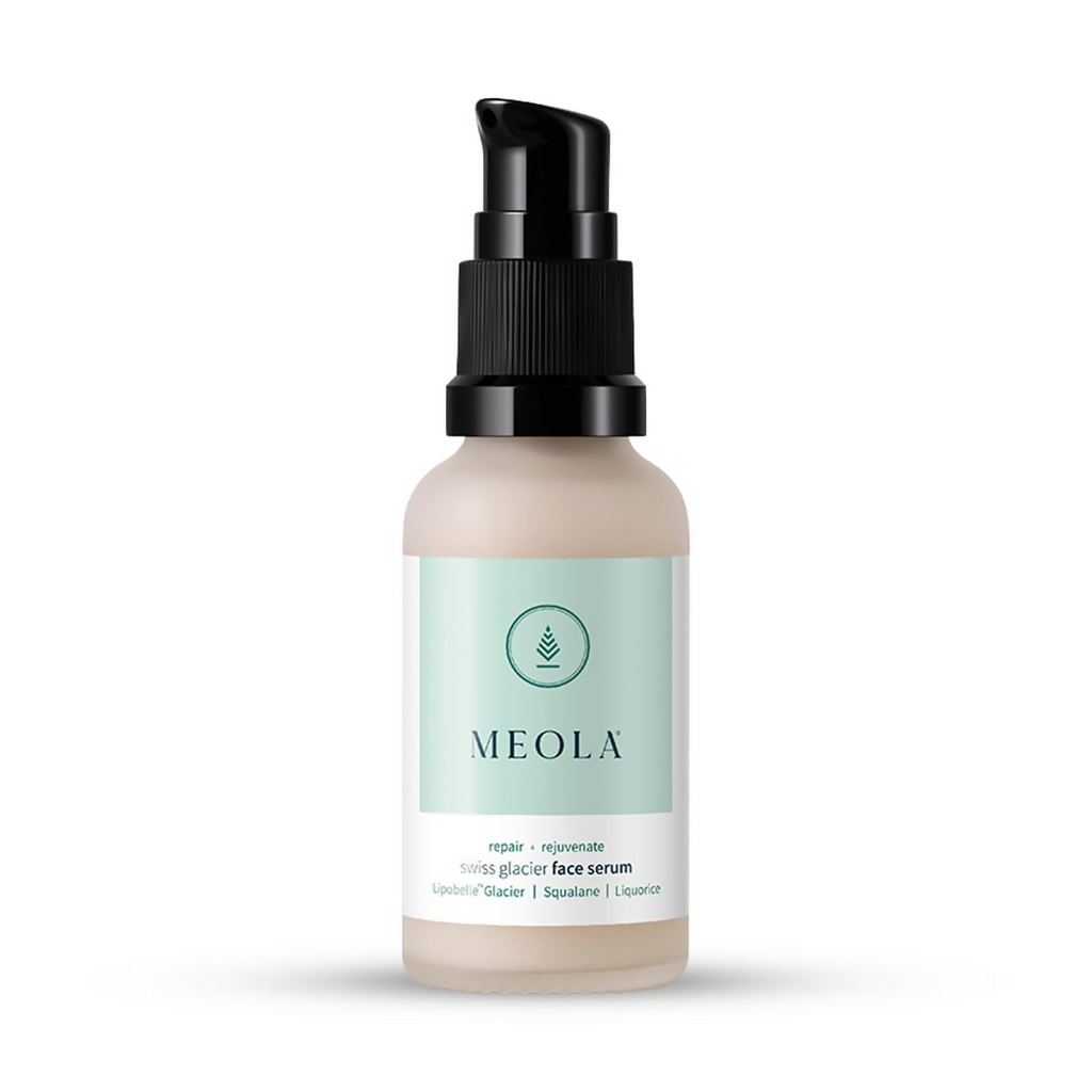 Paraphrase: Meola Swiss Glacier Face Serum About The Product: Barrier Repair: This serum features a potent blend of USDA organic oils, ECOCERT, COSMOS, and NATRUE certified, which contributes to spot correction. The serum is infused with Lipobelle Glacier, a key ingredient sourced from Swiss glaciers, providing a barrier repair effect.