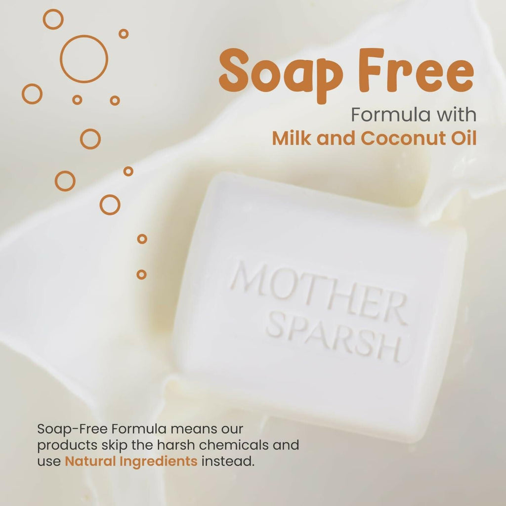 Paraphrase: Mother Sparsh Milky Soft Baby Bathing Soap Bar For Hypoallergenic pH 5.5, Tear-Free Formulation, Prevents Dryness Description: pH Balance Gentle Baby Soap: Our Milky Soft baby bathing bar is designed to cleanse without disrupting the natural pH balance of their tender skin (pH 5.5). Ingredients: Milk Protein, Coconut Oil & Vitamin E Legal Disclaimer: Product images are for information purposes only and may contain additional ingredients.