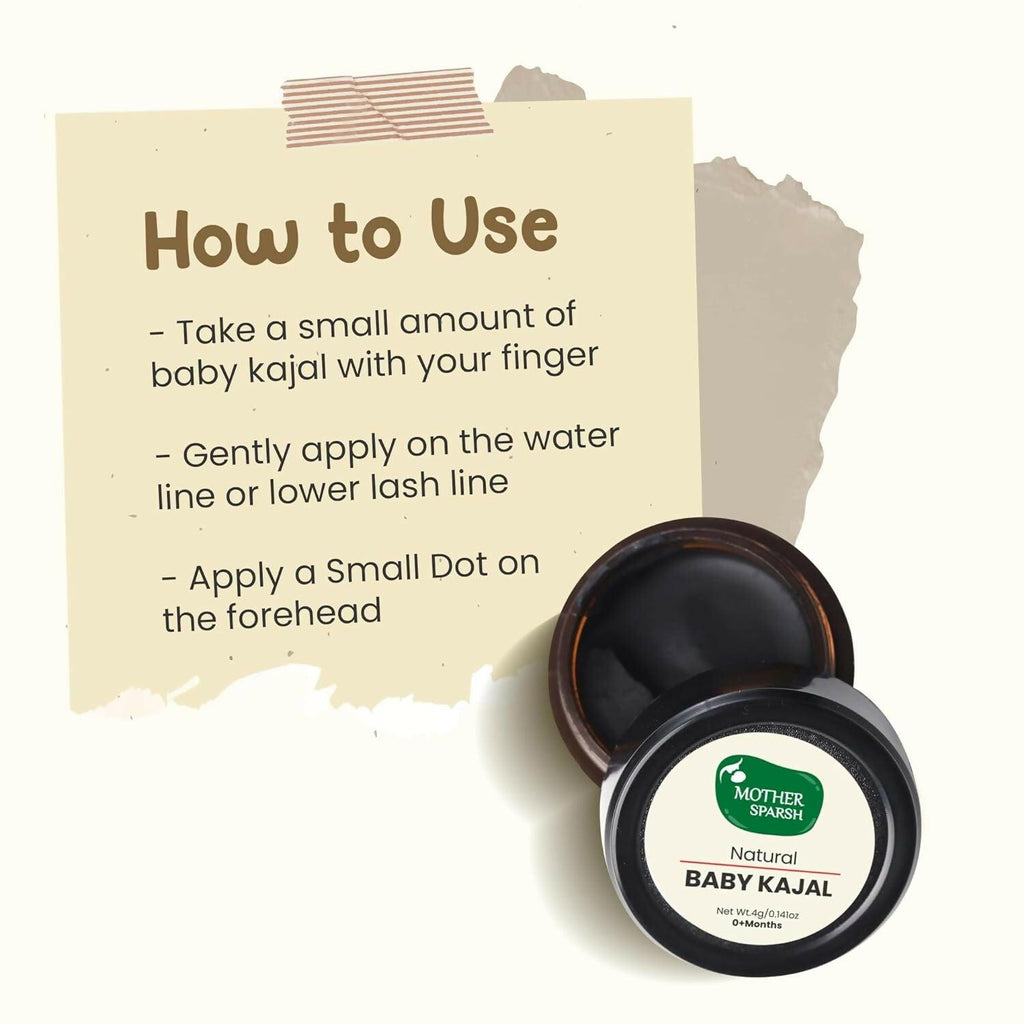 phrase: Mother Sparsh Natural Baby Kajal with Zero Lead Content, Irritation Free & Safe for Newborn Babies Description: Mother Sparsh Natural Baby Kajal with zero lead content, no traces of animal fats. Ingredients: Cocoa Butter, Almond Black Ash, and Pure Cow Ghee Legal Disclaimer: Product images are for illustrative purposes only. Images/packaging/ labels may vary from time to time due to changes made by the manufacturer's manufacturing batch and location