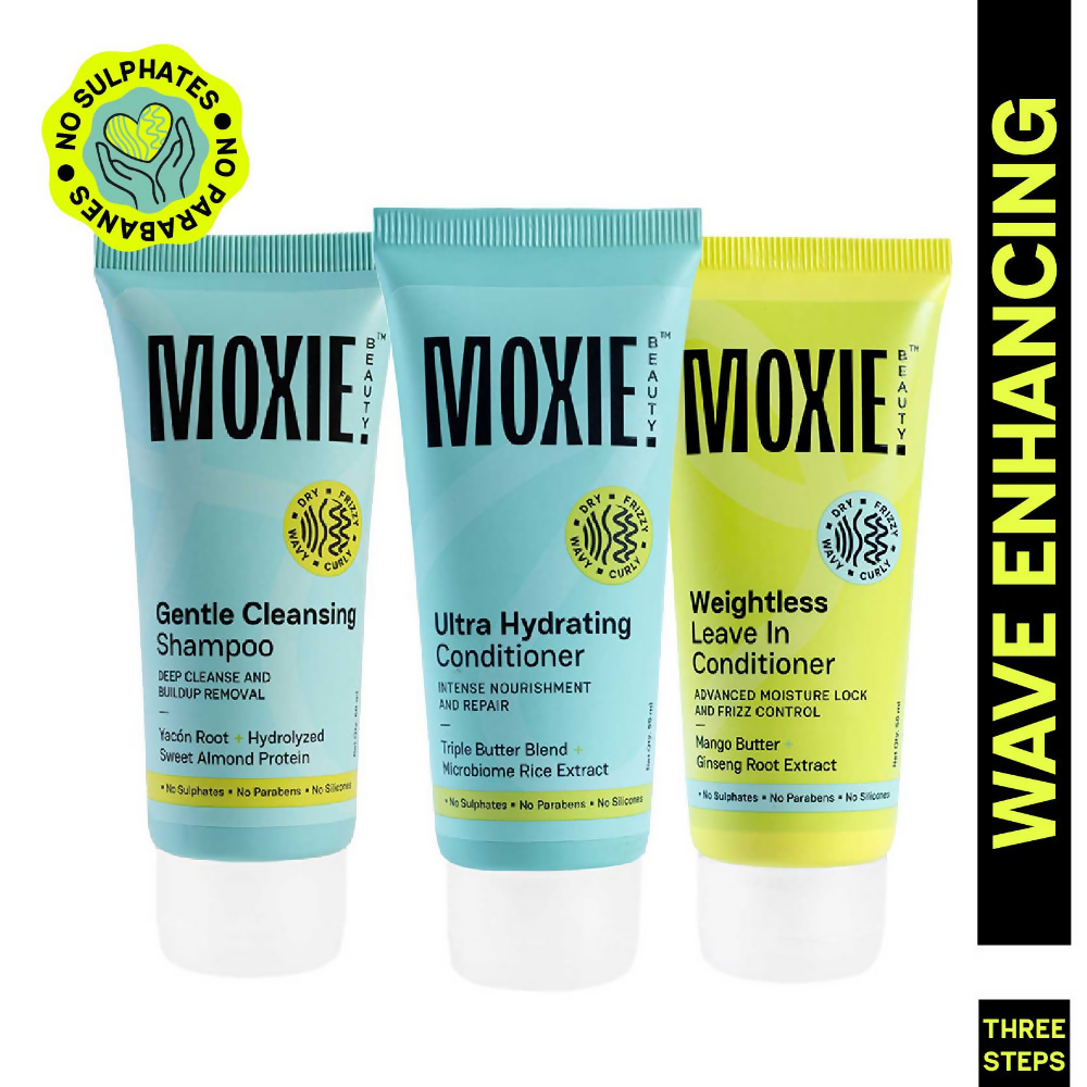 Paraphrase: Moxie Beauty Wavy Essentials Travel Trio This combo contains: Moxie Gentle Cleansing Shampoo :50 ml Moxie Ultra Hydrating Conditioner: 50 ml How to use : Squeeze a coin-sized amount of shampoo, lather in palms, massage into scalp, and wash thoroughly. Then, apply conditioner, working through the strands, and leave for up to two minutes before rinsing.