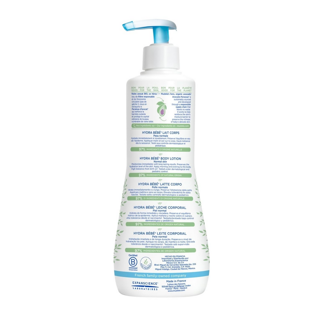 phrase: Mustela Hydra Bebe Body Lotion With Avocado About The Product: Daily care product for the face, from birth.Provides an immediate, long-lasting moisturizing effect. Strengthens the skin barrier, moisturizes, and preserves the skins cellular resources. Ingredients: Jojoba Oil Sunflower Oil Vitamin E Sweet Almond Oil Shea Butter How to use: Apply morning and evening on the body. Legal Disclaimer: Product images are for information purposes only.