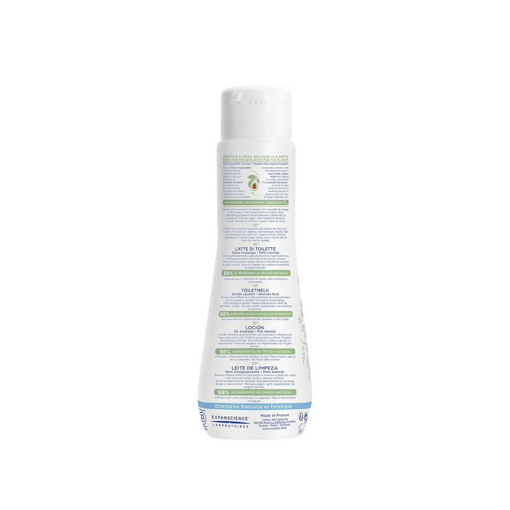 paraphrase: Mustela No Rinse Cleansing Milk With Natural Avocado About The Product: No rinse cleansing milk for the face and bottom can be used from birth on. the no rinse cleansing milk with organically farmed avocado helps to clean baby's face and bottom: effectively and gently eliminates impurities. prevents skin dryness. helps hydration and leaves the skin feeling soft.