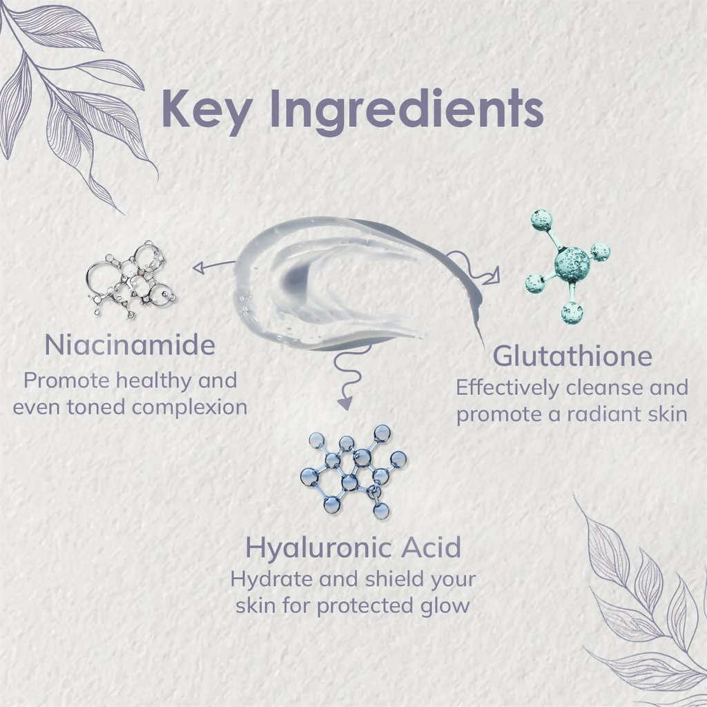 : NatAura Serum: NatAura Glutathione Facial Cleanser About The Product: Brightening & Antioxidant-Rich. Ingredients: Hyaluronic Acid Glutathione Niacinamide How to use: Wet your face with water Apply a small Rinse thoroughly amount of cleanser with water and to your hands and gently massage it onto your face and neck Rinse thoroughly with water and pat your skin dry with a clean towel.