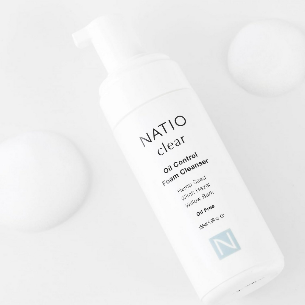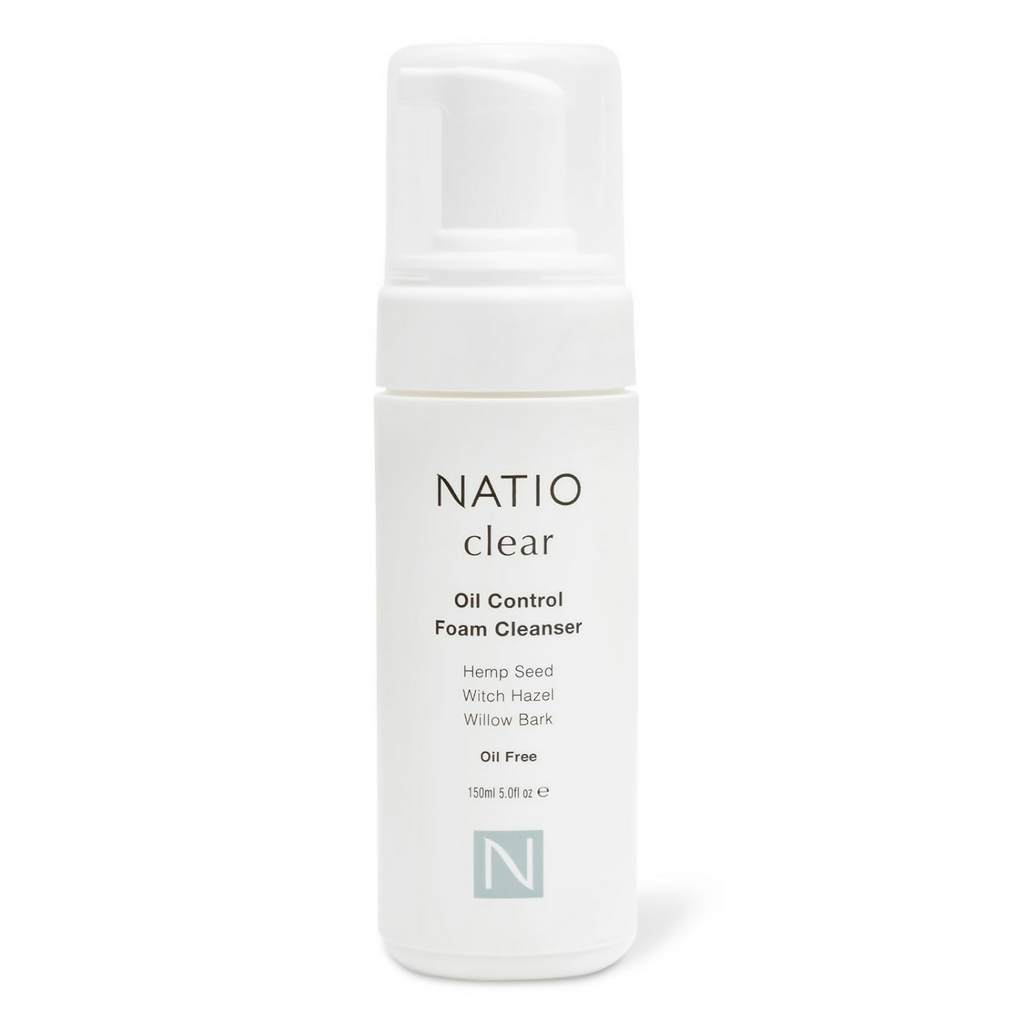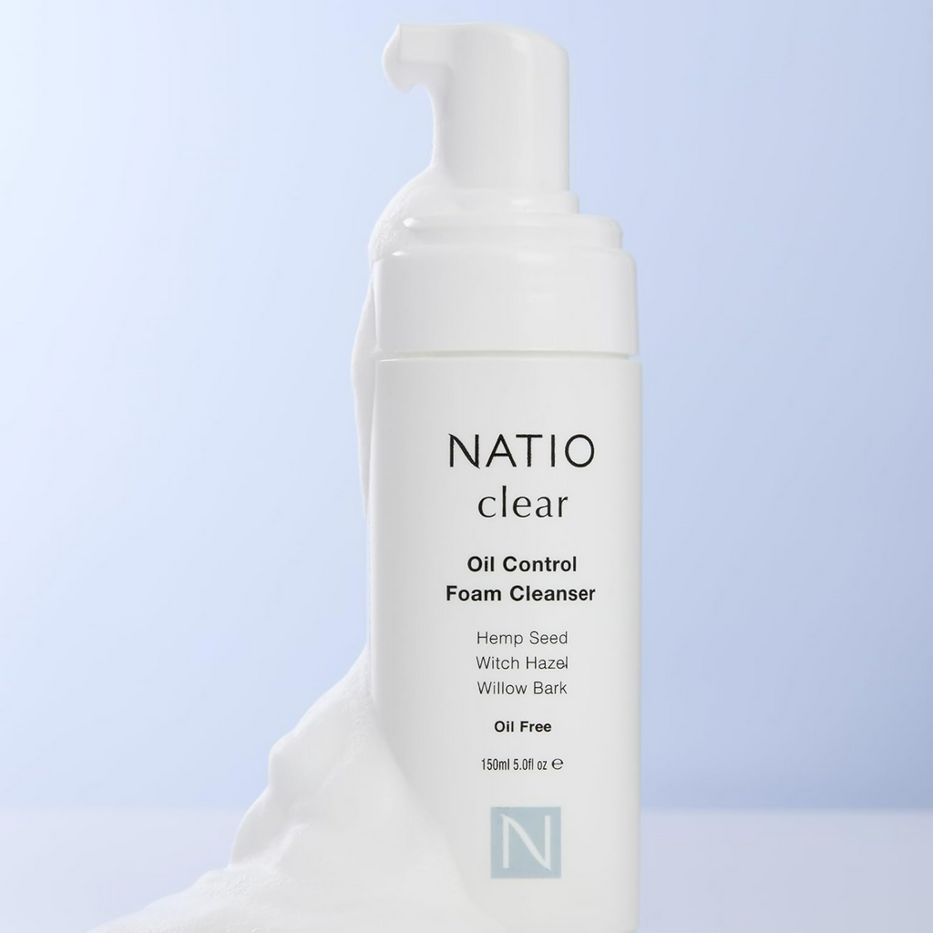 Paraphrase: Natio Clear Oil Control Foam Cleanser About the Product: Rinse away excess oil and pore-clogging impurities with this gentle cleansing foam. Witch Hazel and Willow Bark help remove impurities, naturally exfoliate skin, and prevent future breakouts.