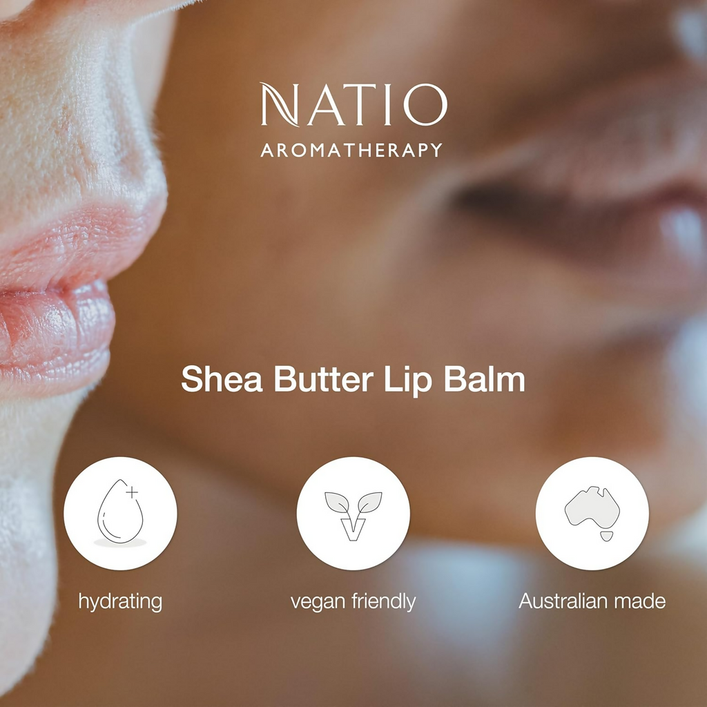Paraphrase: Natio Shea Butter Lip Balm About the Product: Apply Natio Shea butter lip balm as often as required, particularly in cold, dry, or windy conditions, and smooth before bed for intense overnight hydration. Ingredients: Contains Vitamins E, A, and K to help smooth, restore, and render the skin satin soft also contains Aloe vera to moisturize and cool lips.