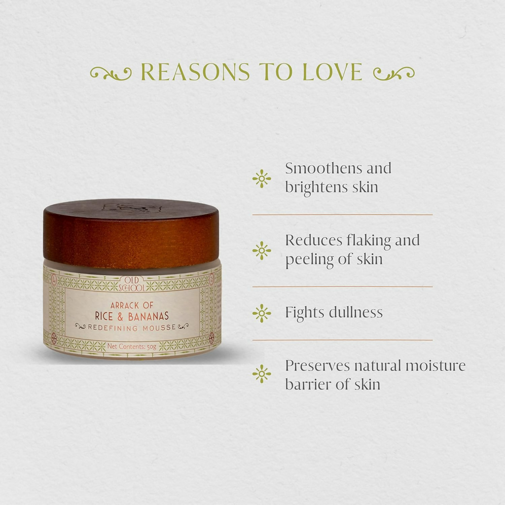 Paraphrase: Old School Rituals Arrack of Rice & Banana Redefining Mousse Natural Face Moisturize About the Product: After cleansing and toning, apply a small amount of moisturiser to your face and neck and gently massage it into the skin. Follow up with sunscreen. Re-apply as required. Ingredients: Black Rice, Navara Rice, Banana Extract, Vitamin-E Legal Disclaimer: Product images are for illustrative purposes only. Images/packaging/ labels