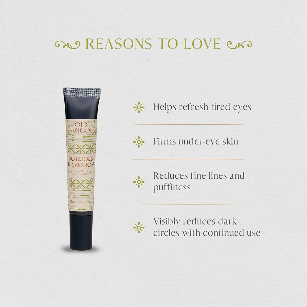 phrase: Old School Rituals Potatoes & Saffron Reviving Eye Mask About the Product: Apply the mask around the eyes and leave it on for 15-20 minutes. Rinse with cold water and pat dry. Use twice a week for best results. Use twice a week for best results.