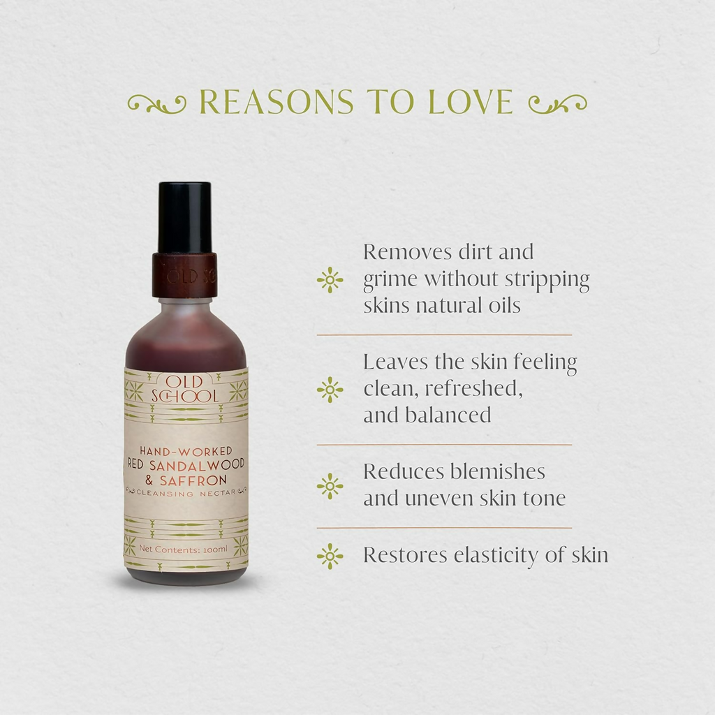 Paraphrase: Old School Rituals Red Sandalwood & Saffron Age Defying Cleanser Face Wash About the Product: Wet your face and neck with water and massage a small amount of the facewash onto your skin in circular motion using your fingertips. Rinse with water and pat dry. Follow up with toner, moisturiser, and sunscreen. Ingredients: Red Sandalwood, Saffron, Triphala, Licorice Legal Disclaimer: Product images are for illustr