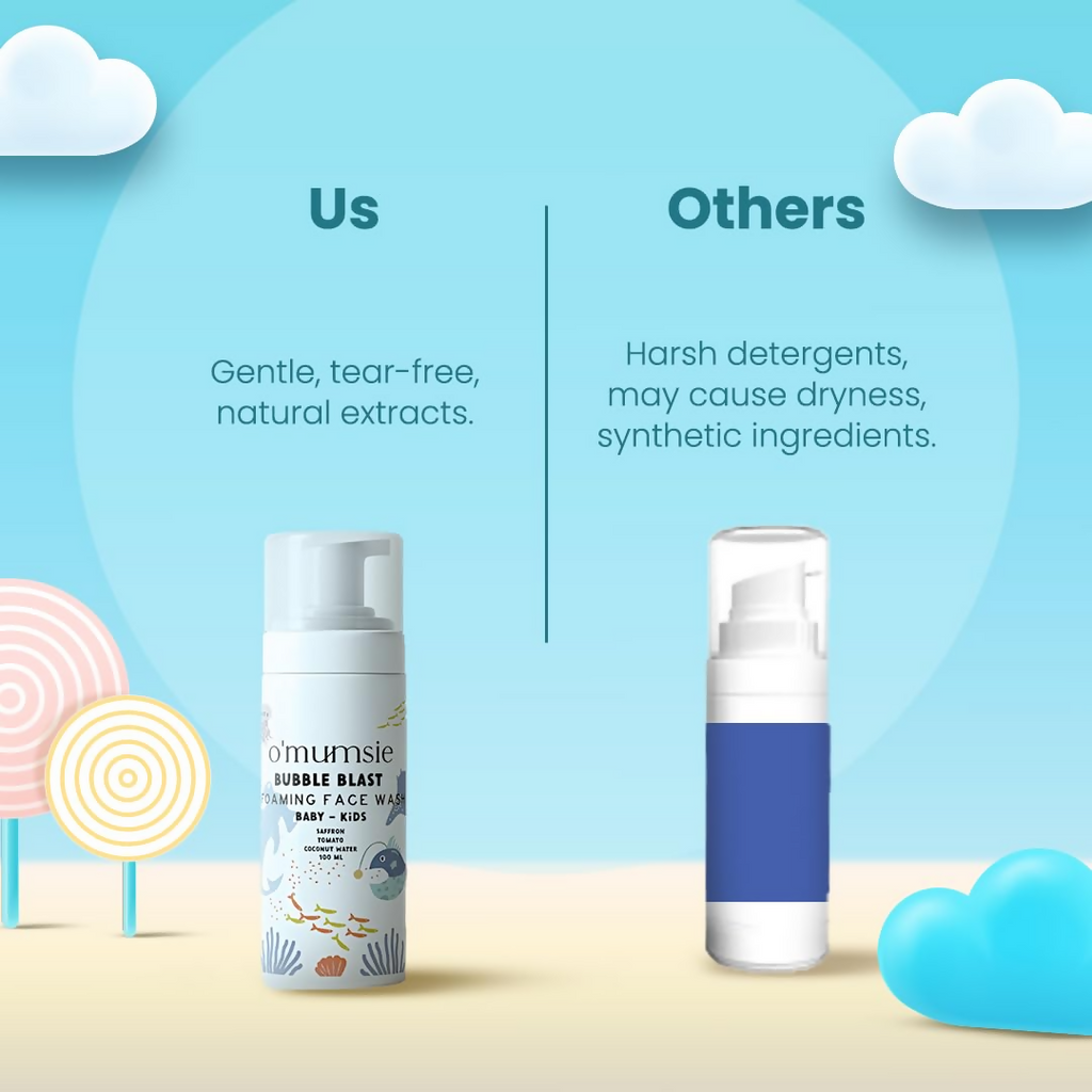 phrase: O'Mumsie Bubble Blast Kids Foaming Face Wash About The Product: Bubble Blast Foaming Face Wash by omumsie is specially crafted to provide gentle, effective cleansing for your little one's delicate skin. Designed with utmost care, this foaming face wash perfectly blends nature's finest ingredients, ensuring a refreshing and soothing experience for babies and kids.
