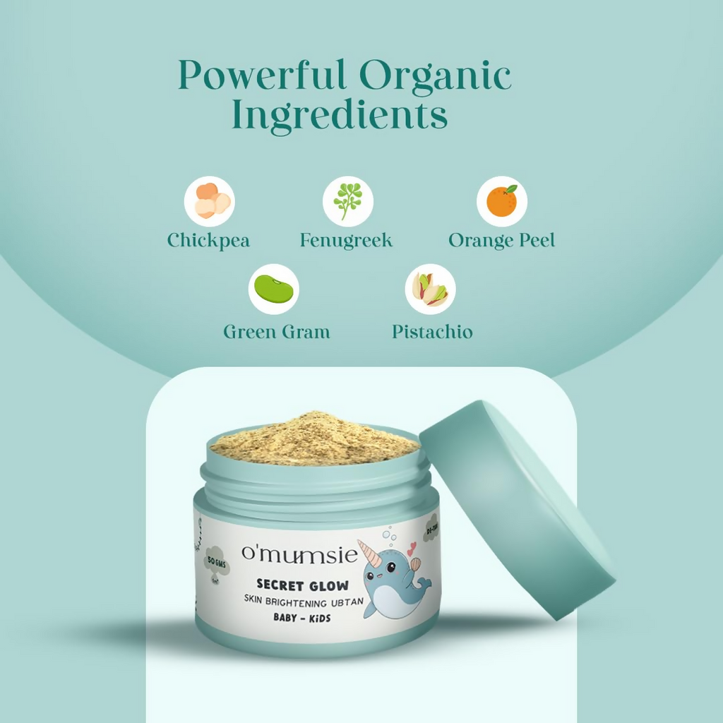 phrase: O'Mumsie Secret Glow Skin Brightening Baby Ubtan About The Product: Discover Omumsie Organic Baby Ubtan, made with natural and safe ingredients for gentle cleansing, detaining, skin brightening, and enhancing skin tone.