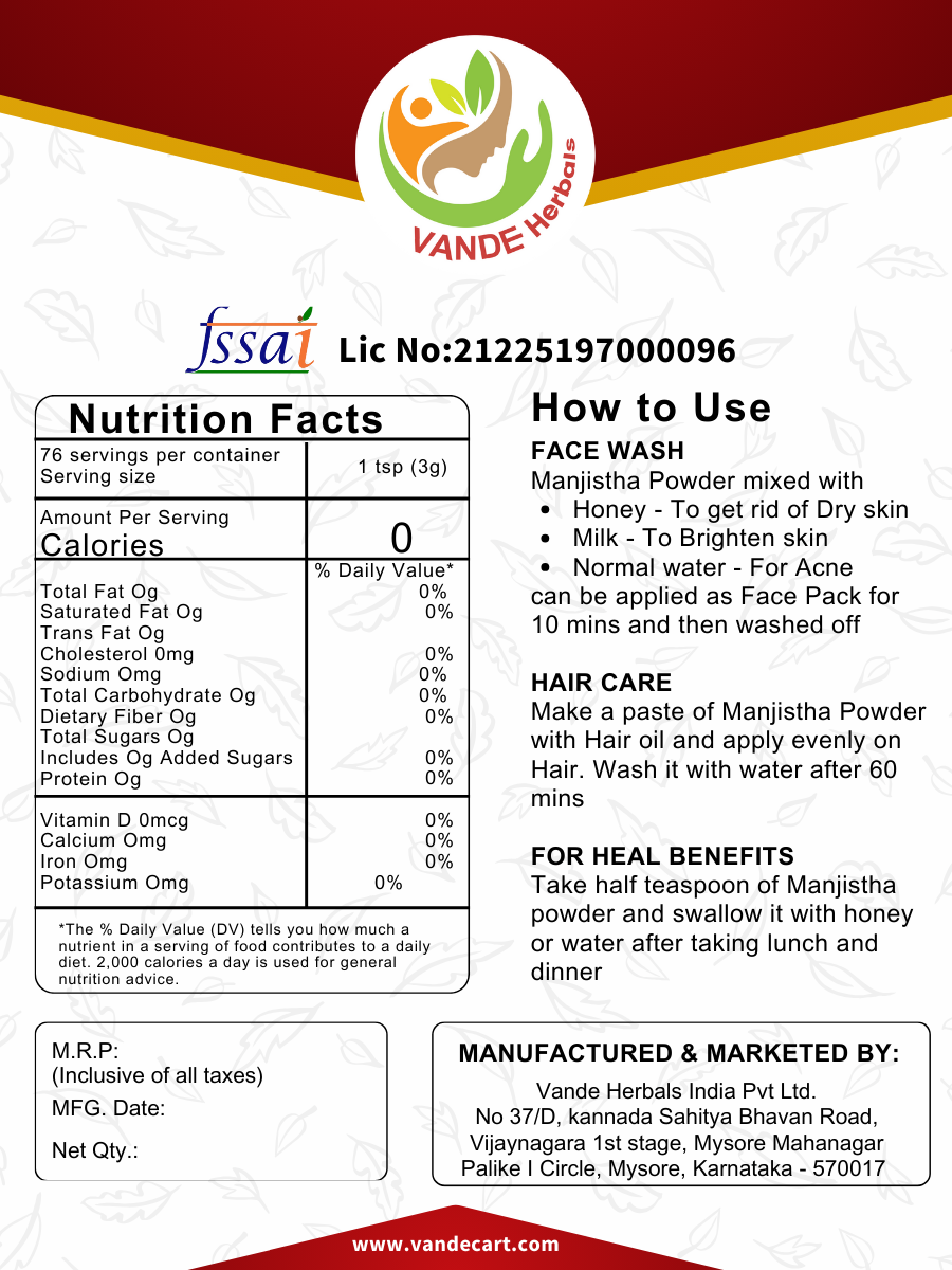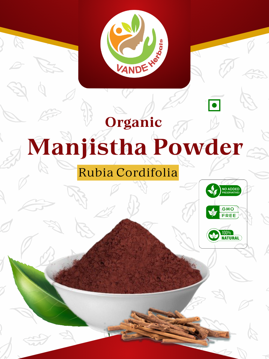 Organic Manjistha Powder, 100 G | Vande Herbals |100% Pure & Natural Manjistha Powder for Skin Whitening| Manjistha Powder for face, Hair Care & Skin Care