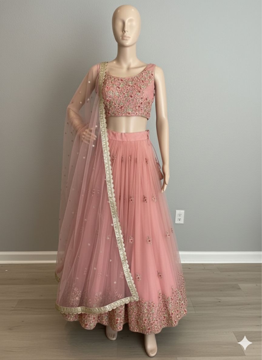 A delicate pastel pink net lehenga featuring an intricately embroidered sleeveless choli. The flowing skirt is paired with a sheer matching dupatta finished with subtle gold borders, creating an elegant look ideal for weddings and celebrations.