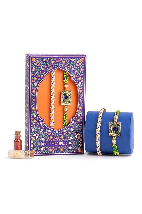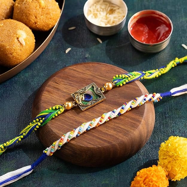 - Elegant Designer Rakhis – Includes one Mayur Moti Rakhi and one Morpankh Pendant Rakhi with intricate detailing.