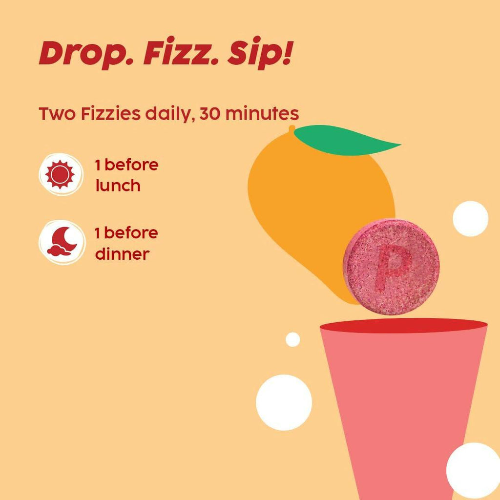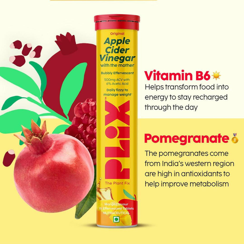 Paraphrase: PLIX The Plant Fix Apple Cider Vinegar Effervescent Tablets with Mother - Mango About the Product: Helps Manage Cravings: Just dissolve a tablet in a glass of water & relish a refreshing, fizzy, mango drink. Replace your soda cravings with a sugar-free fizzy drink that also has health benefits.