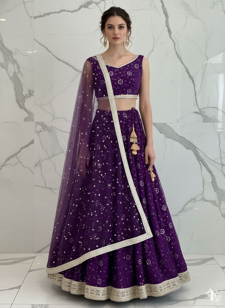 A rich purple lehenga set featuring intricate sequin and thread embroidery on premium georgette fabric. Designed for festive occasions, this ensemble offers a balance of traditional craftsmanship and modern styling.