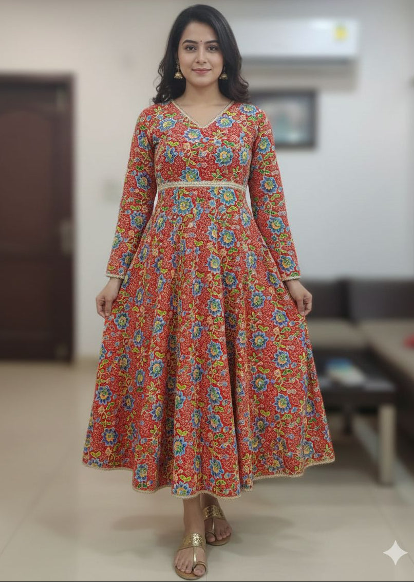 Red Coral Floral Georgette A Line Dress | Serene Fashions