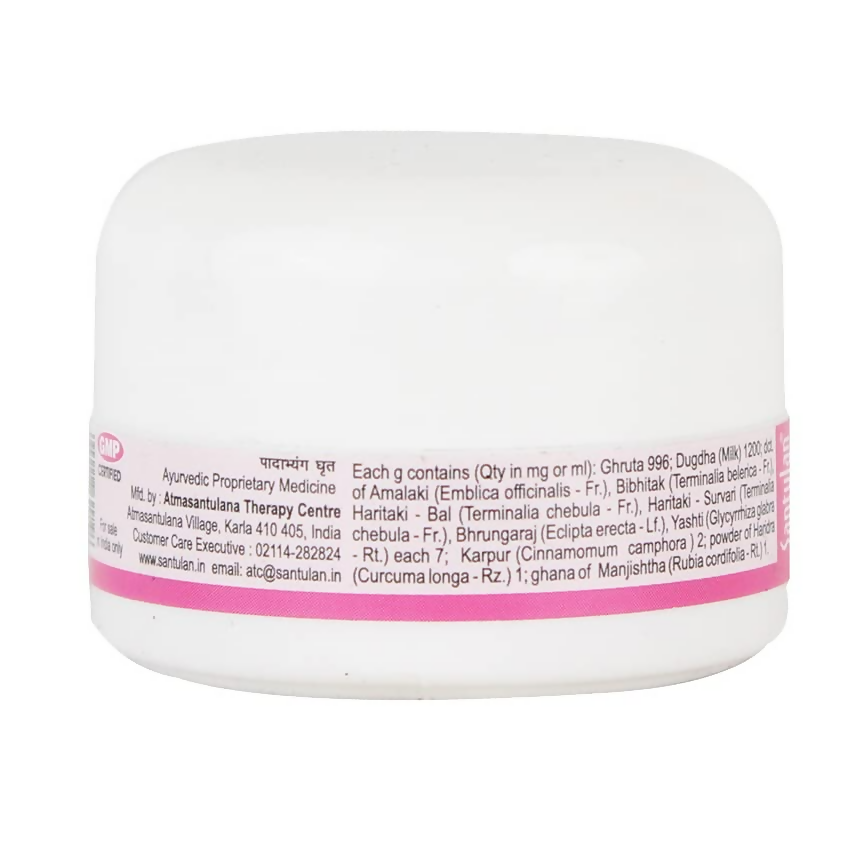 : Santulan Ayurveda Padabhyanga Ghruta Ingredients: Ghruta, Milk (Kshir), Hirda (Haritaki) Bal, Hirda (Haritaki) Bal, Hirda (Haritaki) Survari, Amla (Amalaki), Behada (Bibhitak), Maka (Bhrungraj), Yashtimadhu (Jyeshthamadha), Kapur B