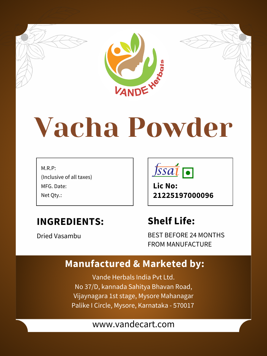 Vacha Powder| 100gm | Vande Herbals | Acorus Calamus | Sweet Flag